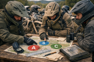 Hay mapas impresos, brújula, escuadra, radio y decisiones en equipo.